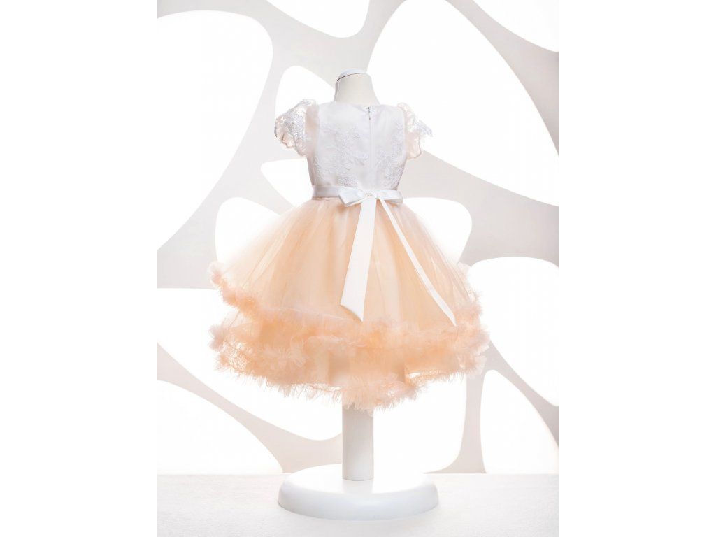 Saténové dětské šaty na svadbu pre malé družičky, s marhuľovou tylovou sukňou.