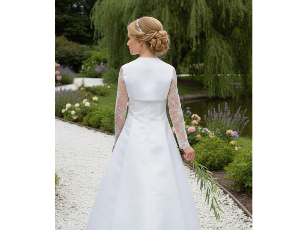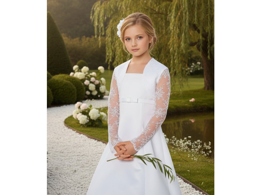 Detské saténové bolerko pošité čipkou, s krajkovými rukávmi.
