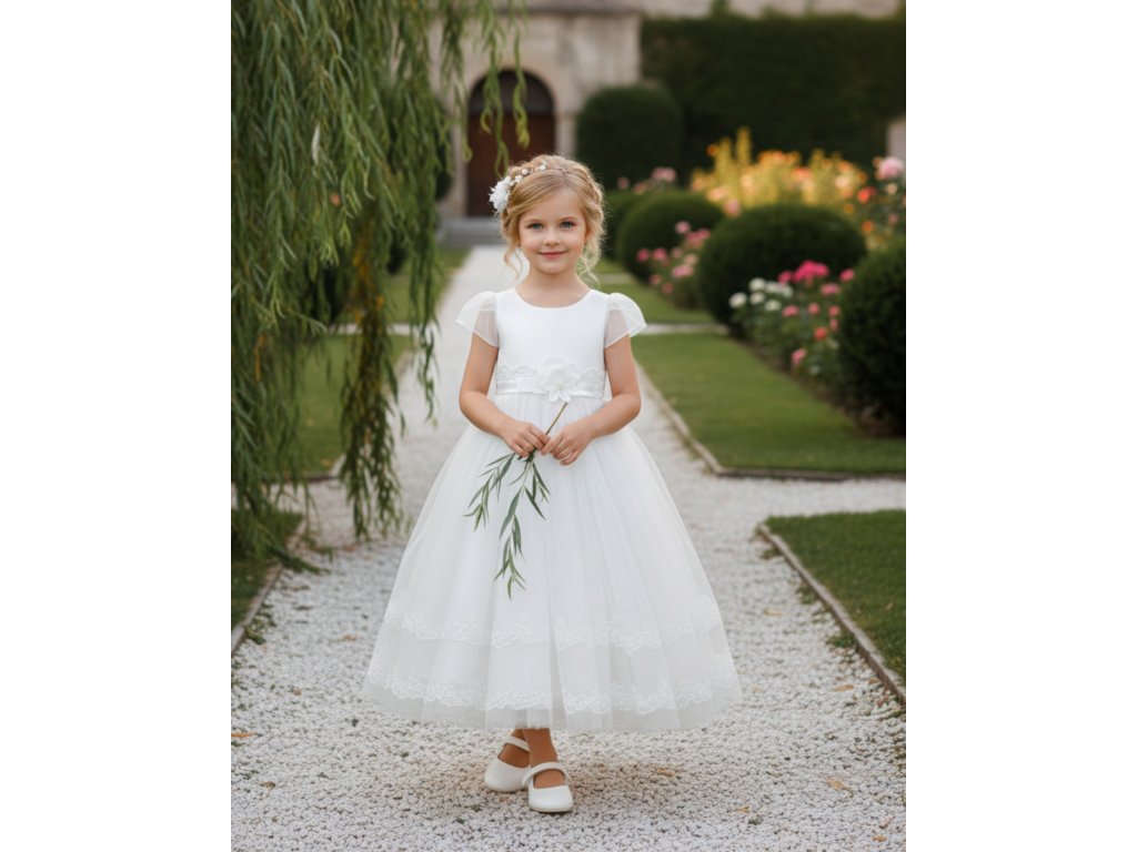 Detské šaty pre družičky, potiahnuté tylom a lemované čipkou.