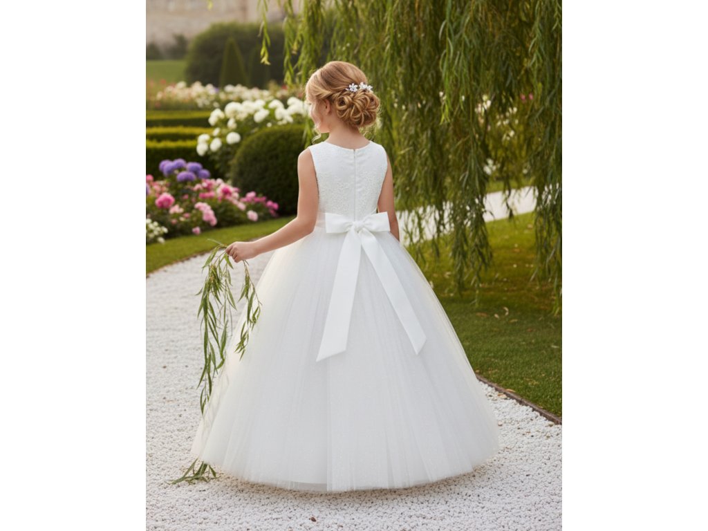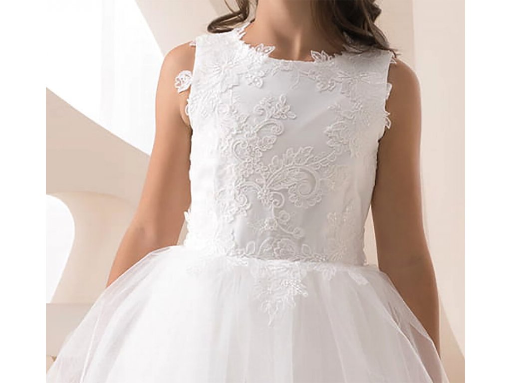 Detské šaty pre družičky, s čipkovaným vrchným dielom a tylovou sukňou.