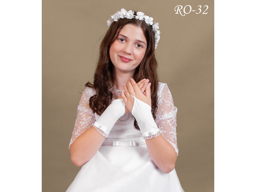 Detské svadobné rukavice s organzovým lemom, zdobené kryštálom.