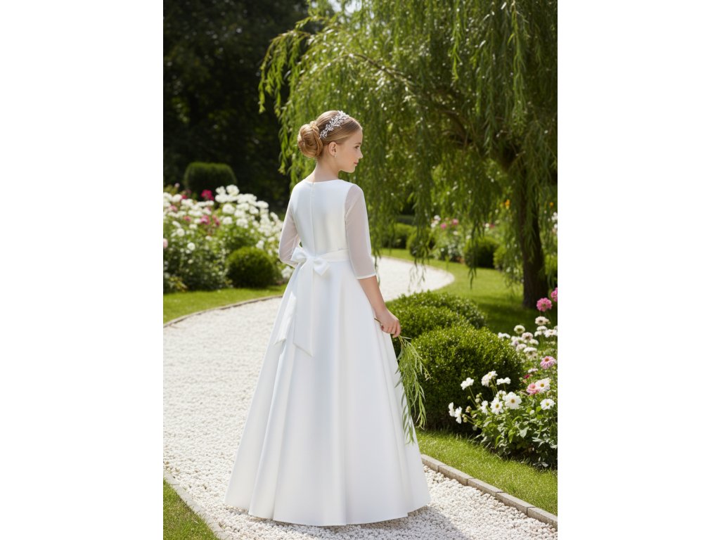 Jednoduché saténové šaty na prvé sväté prijímanie.