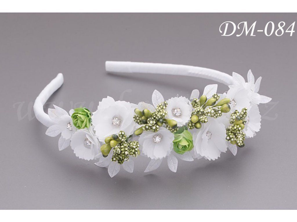 Svadobná čelenka s bielymi a zelenými kvetmi DM-084
