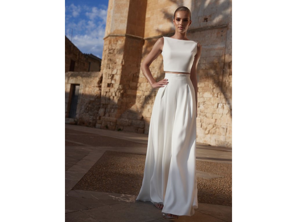 Dvojdielne nohavicové svadobné šaty so saténovým crop topom a svadobnými nohavicami.
