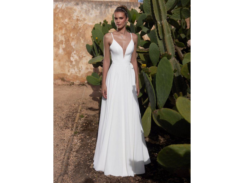 Dvojdielne svadobné šaty so saténovým topom a šifónovou sukňou.