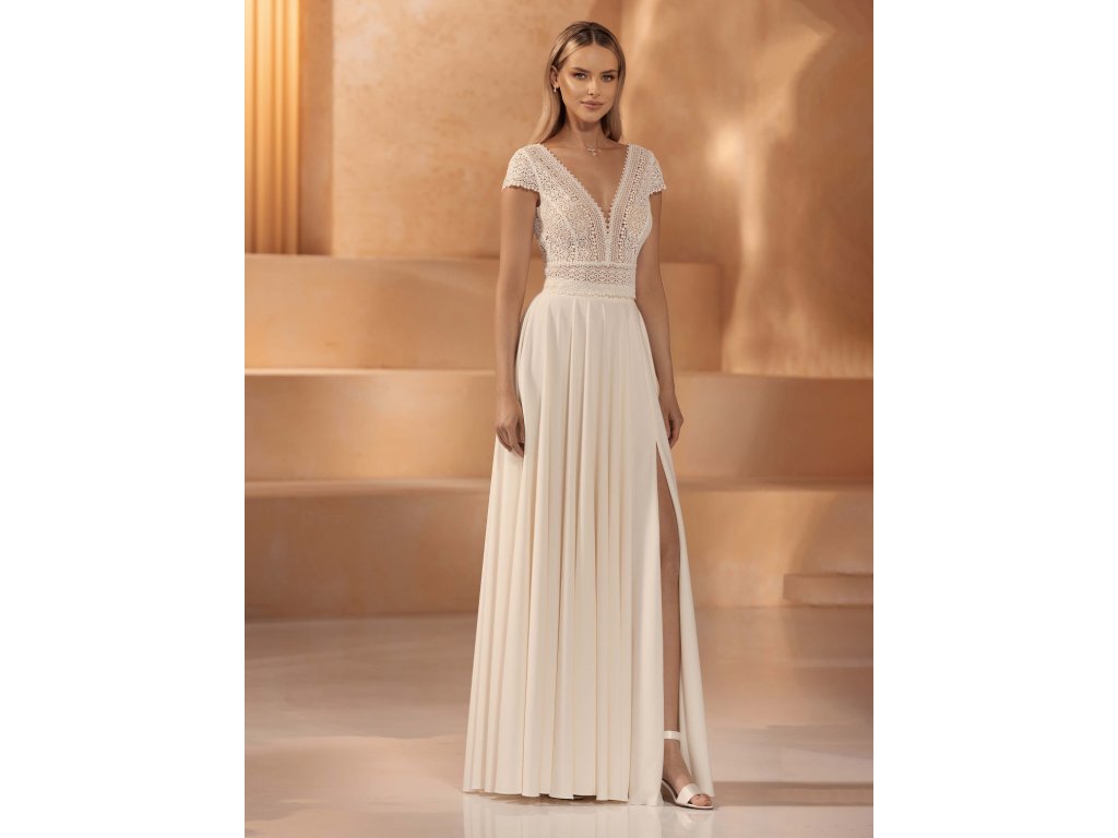 Dvojdielne svadobné šaty so so splývavou sukňou.