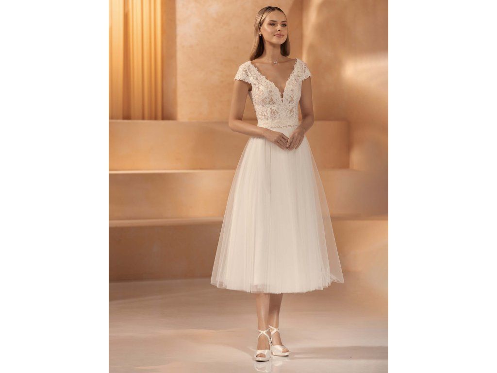 Dvojdielne svadobné šaty s trblietavým čipkovaným vrchom a krátkou tylovou sukňou.