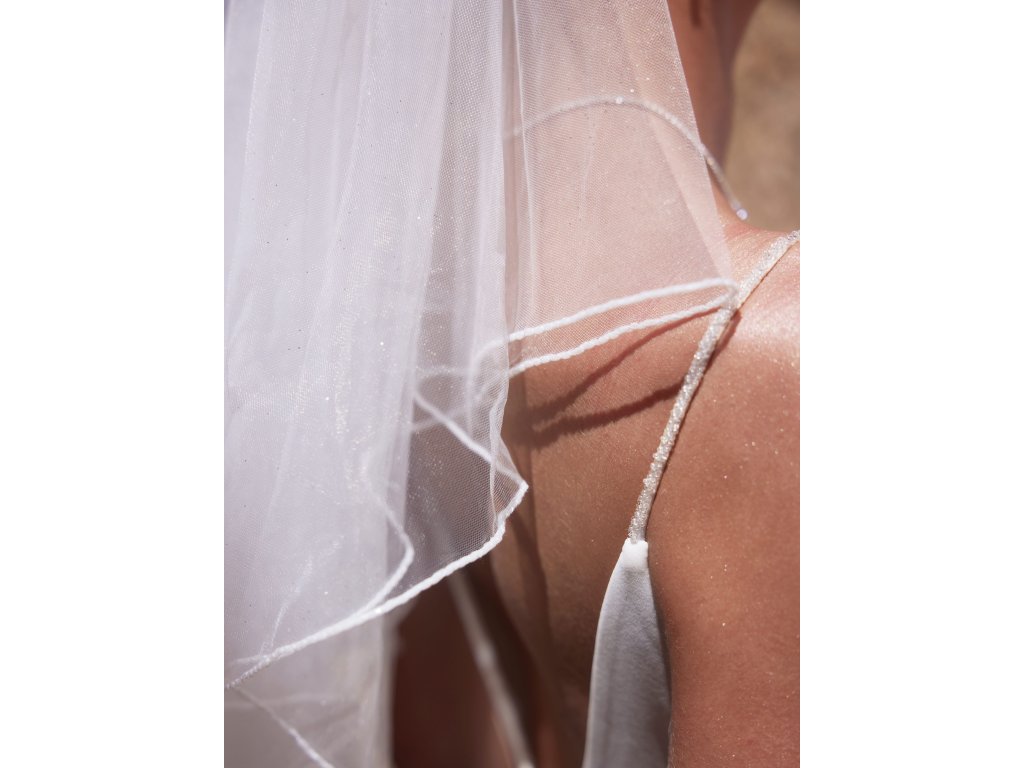 Dvojvrstvový svadobný závoj s korálkovým okrajom.
