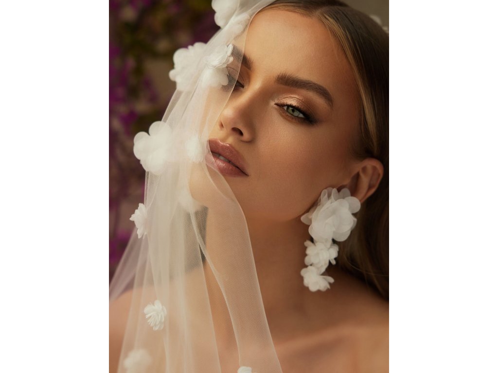 Luxusný svadobný závoj ručne zdobený 3D kvetmi.