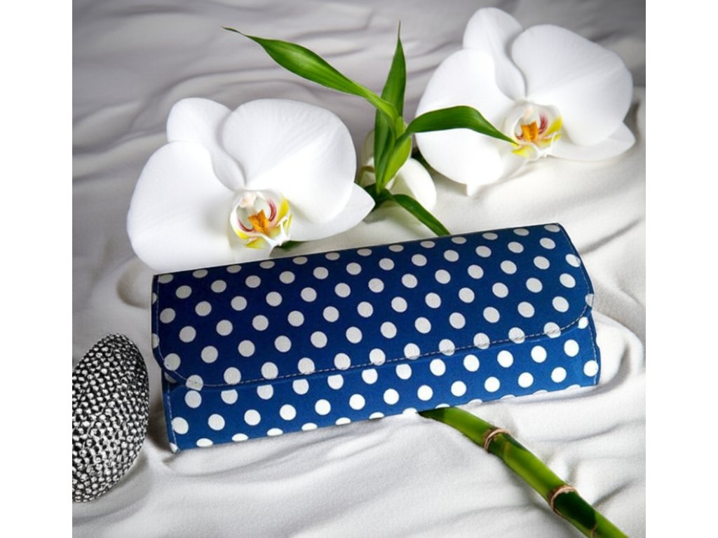 › Svadobné a spoločenské kabelky › Listové kabelky - malé › Listová spoločenská kabelka - modrá s bielymi bodkami