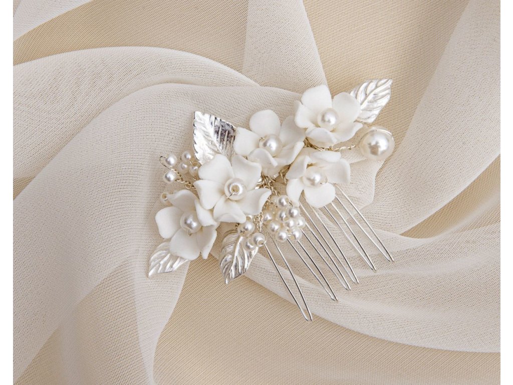 Jemný svadobný hrebienok do vlasov, zdobený bielymi keramickými kvetmi, lístkami a perličkami.