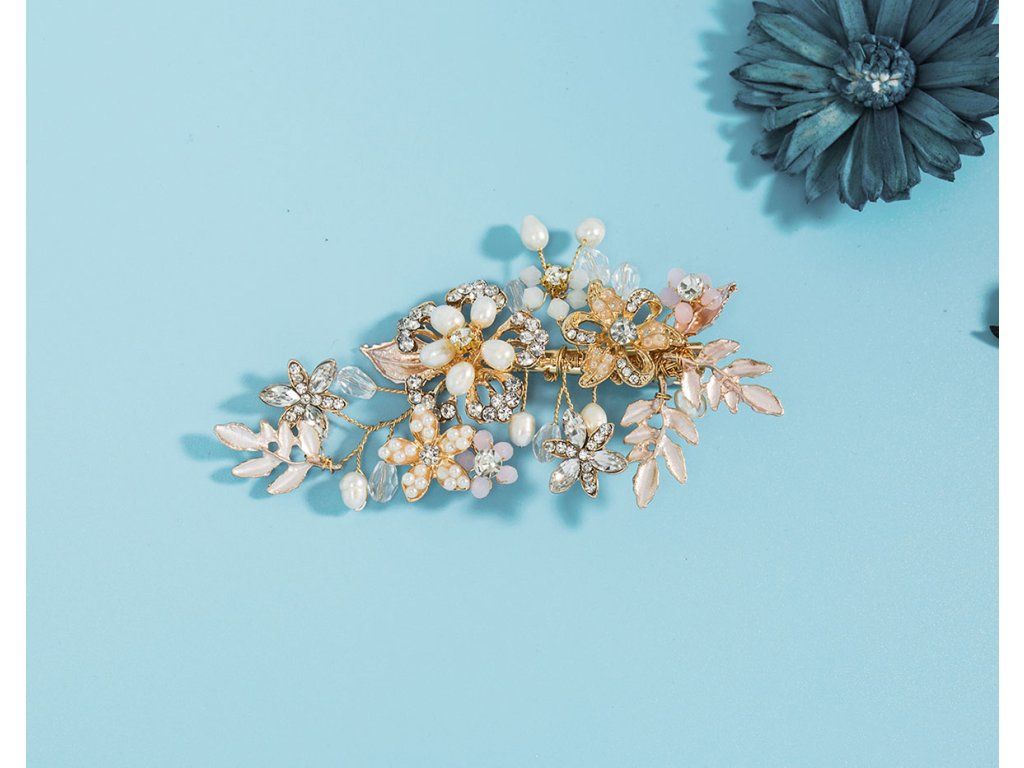 Zlatorůžová svadobná spona so štrasom a perličkami WL-2939