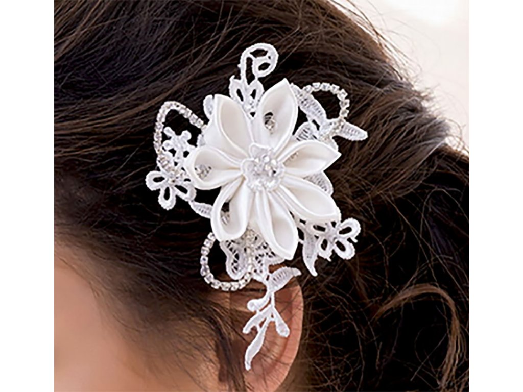 Svadobný hrebienok do vlasov, zdobený kanzashi kvetinou.