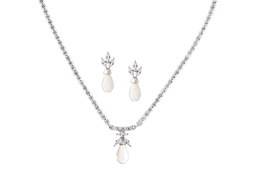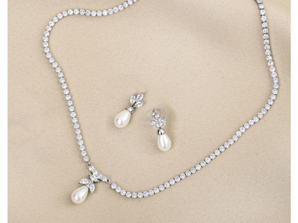 Elegantný svadobný set šperkov - náušníc a náhrdelníka s ručne lešteným perlami a kubickými zirkónmi.