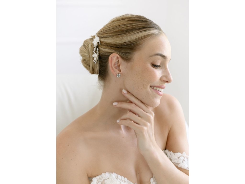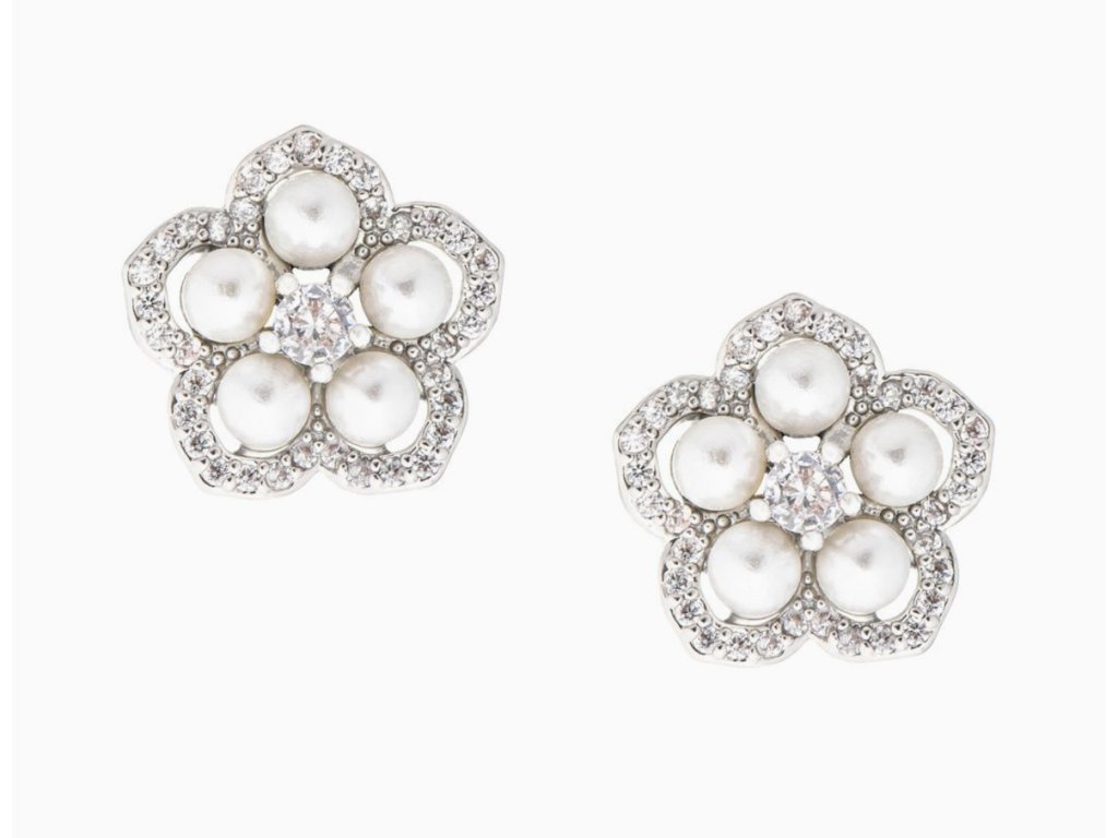 Svadobné náušnice v tvare kvetu, zdobené krémovými perlami a trblietavými kubickými zirkónmi.
