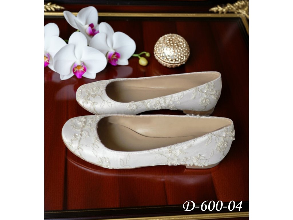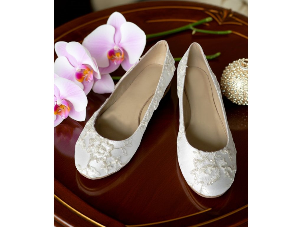 Saténové svadobné balerínky potiahnuté čipkou, zdobenou korálkami a vyšívanou zlatou niťou.