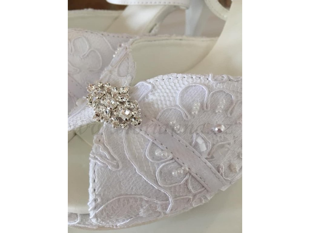 Čipkované svadobné topánky na platforme, zdobené štrasovou sponou.