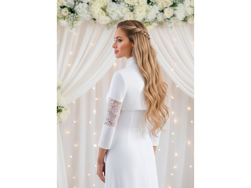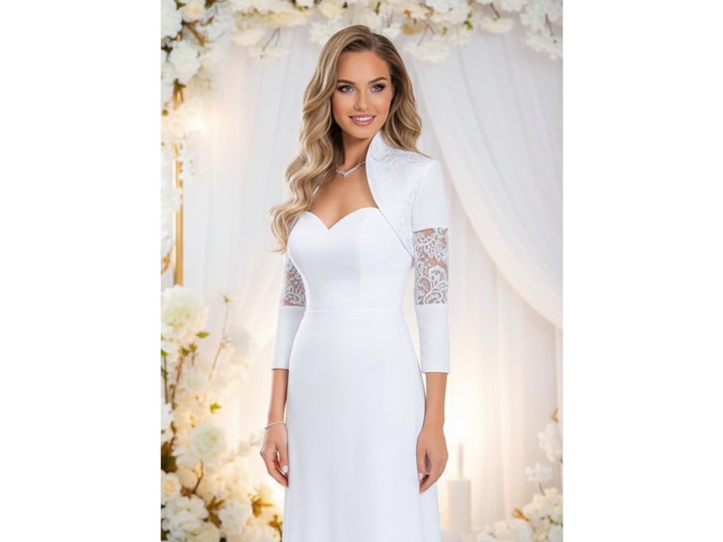 Saténové svadobné bolerko s čipkovou vsadkou na rukávoch.