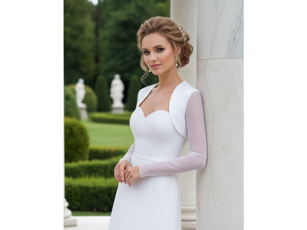 › Svadobné bolerka › Saténové svadobné bolerko s tylovým rukávmi - biele: BF-194