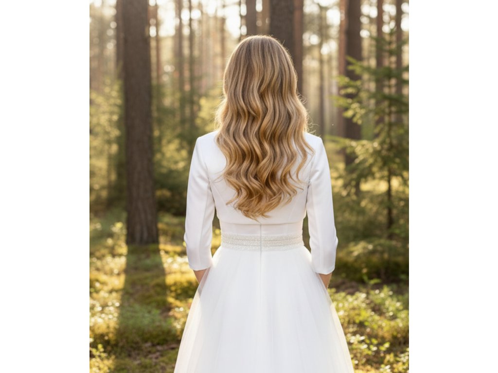 Saténové svadobné bolerko s úzkymi rukávmi.