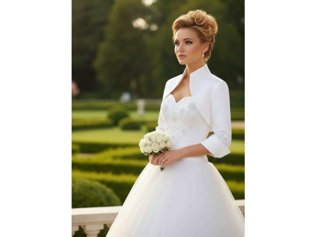› Svadobné bolerka › Saténové svadobné bolerko s výraznými manžetami - biele: BF-13