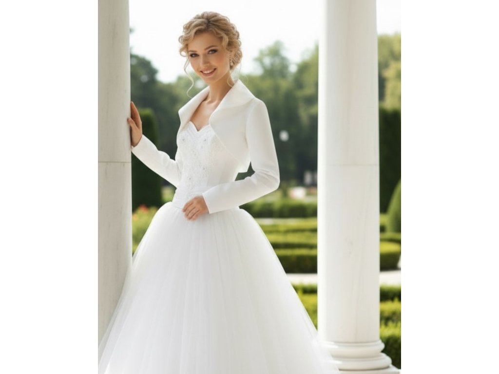 Saténové svadobné bolerko s golierom a dlhým rukávom.