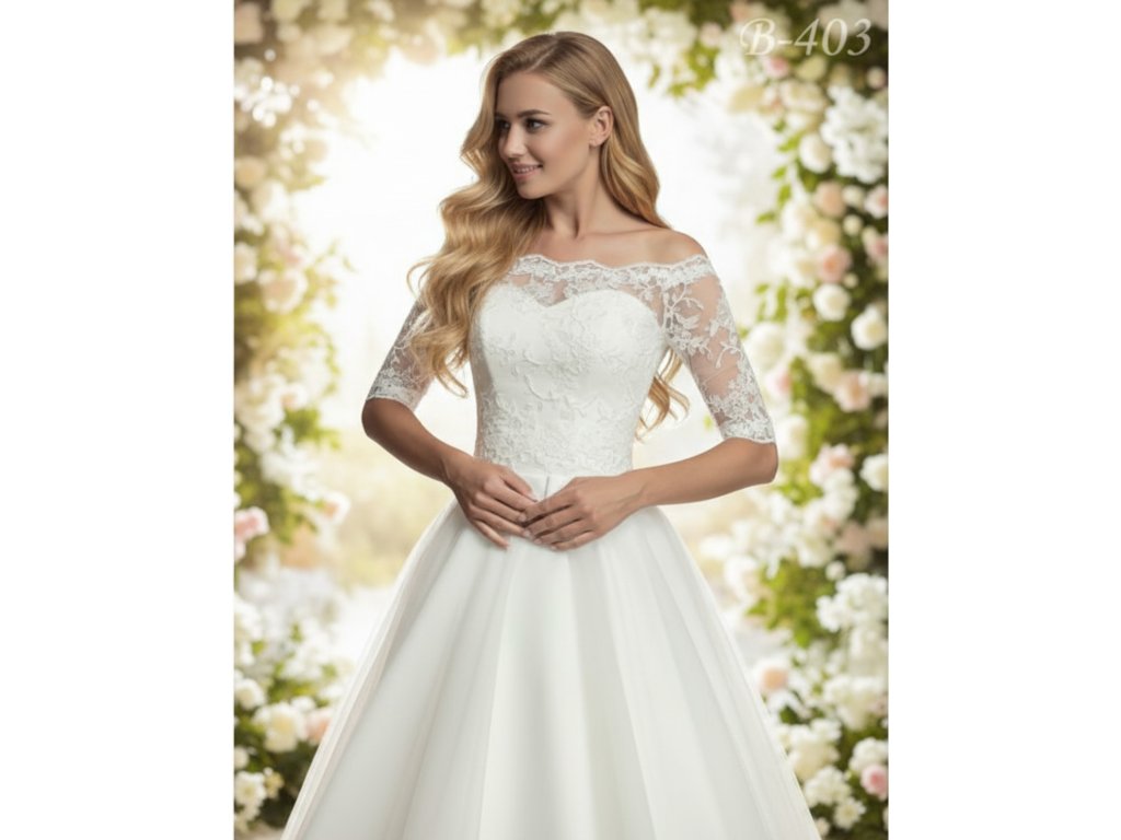 Svadobný čipkový kabátik s holými ramenami.