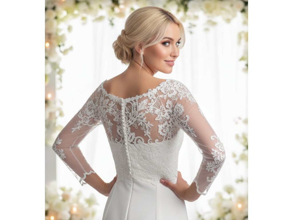 Svadobný kabátik s bavlnenou čipkovou aplikáciou.