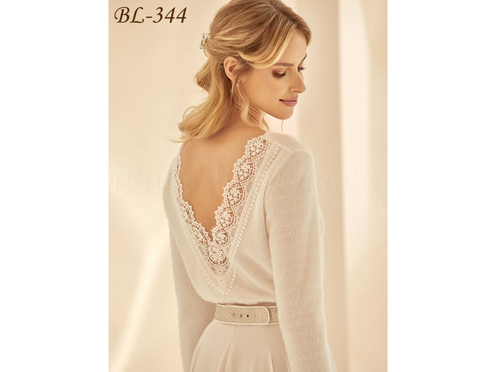 Svadobný sveter s kašmírovým efektom a V-výstrihom s čipkou na chrbte.