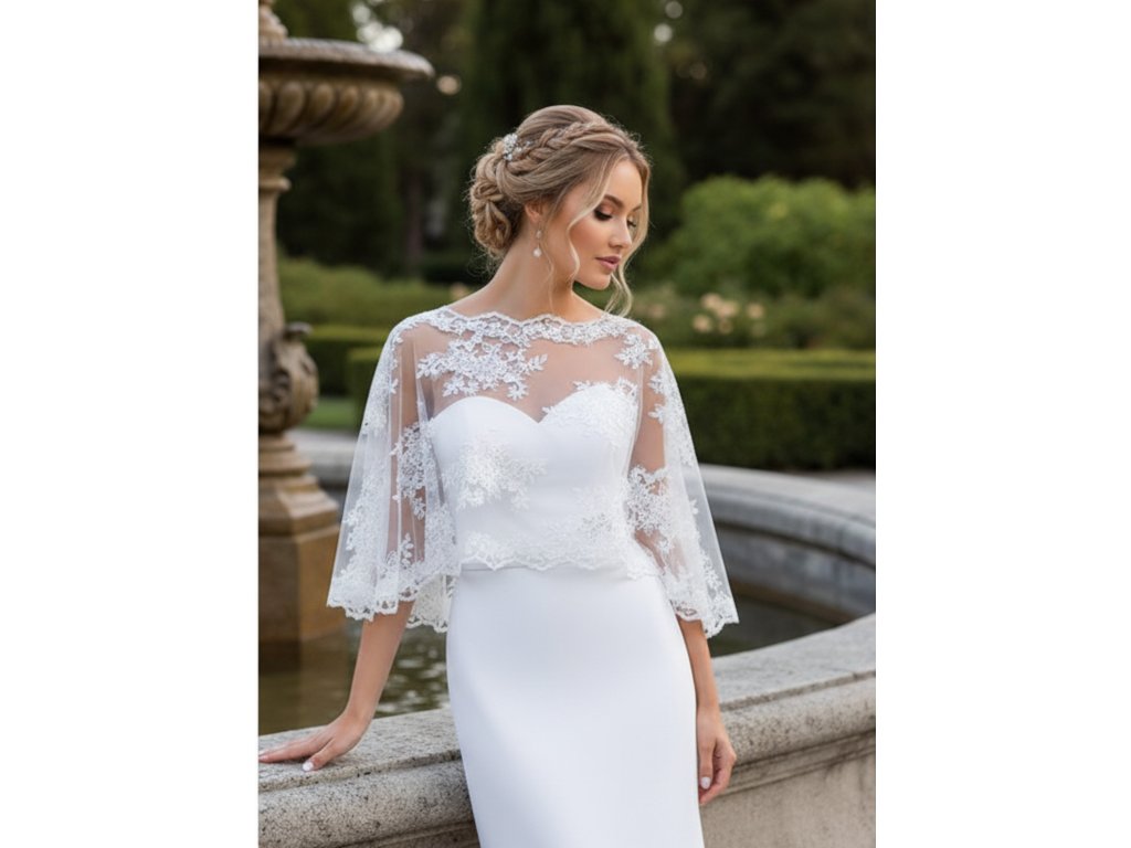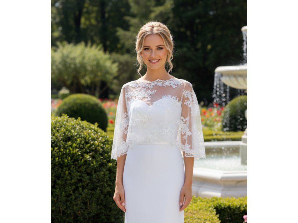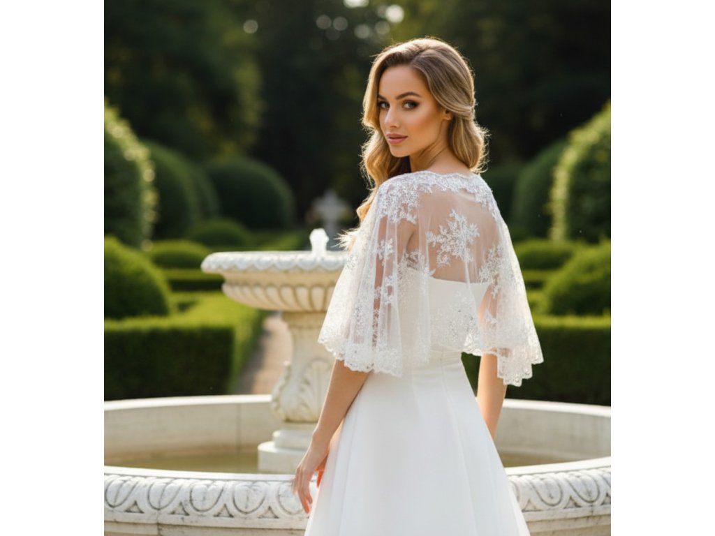 Čipkovaná svadobná pelerínka zdobená jemnými flitrami.