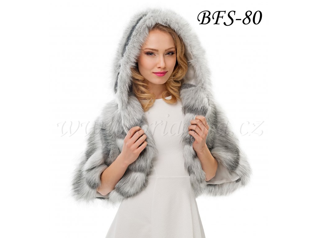 Kožušinová spoločenská pelerínka s kapucňou - šedá žíhaná: BFS-80
