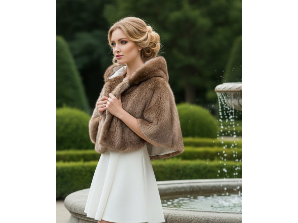 Kožušinová spoločenská pelerínka s kapucňou.