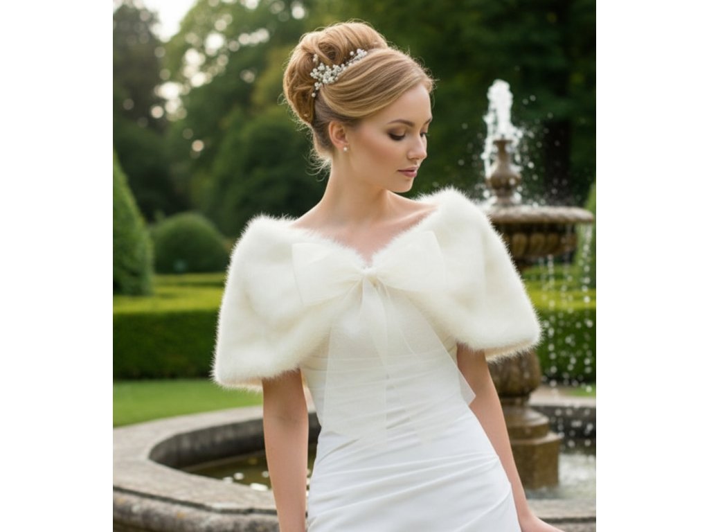 Svadobná pelerínka z imitácie kožušiny s mašľou z organzy.
