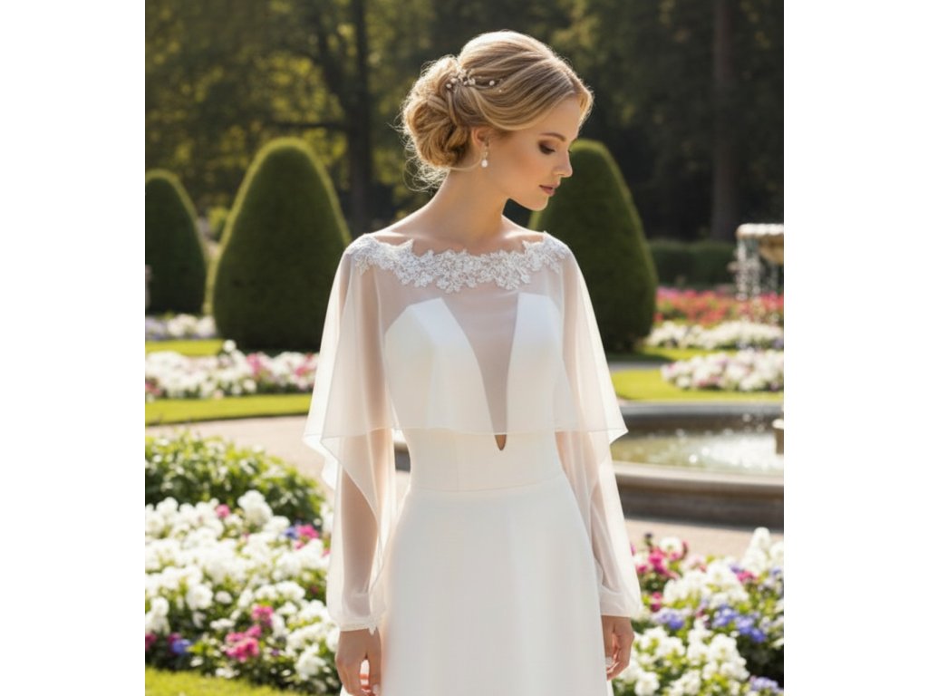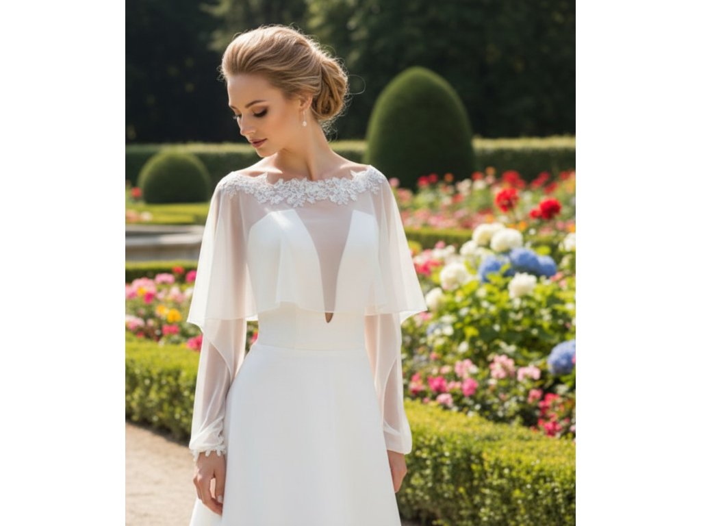 Svadobná pelerínka z elastického tylu, lemovaná kvetinovou čipkou.