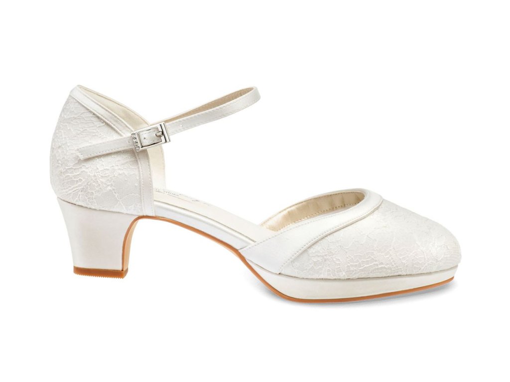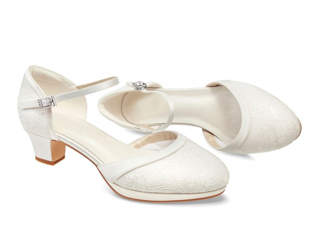 Saténové svadobné topánky na platforme, zdobené trblietavou čipkou.