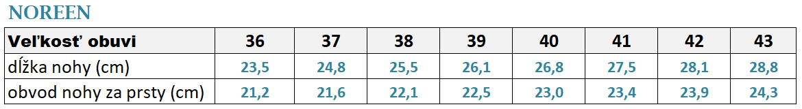 Dostupné veľkosti 36 - 43 (ak sa vaša veľkosť pohybuje medzi dvoma veľkosťami, odporúčame zvoliť väčšiu veľkosť).