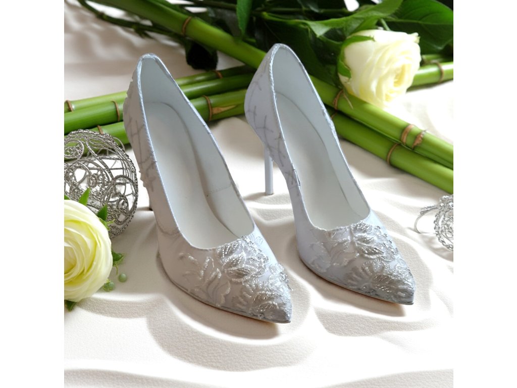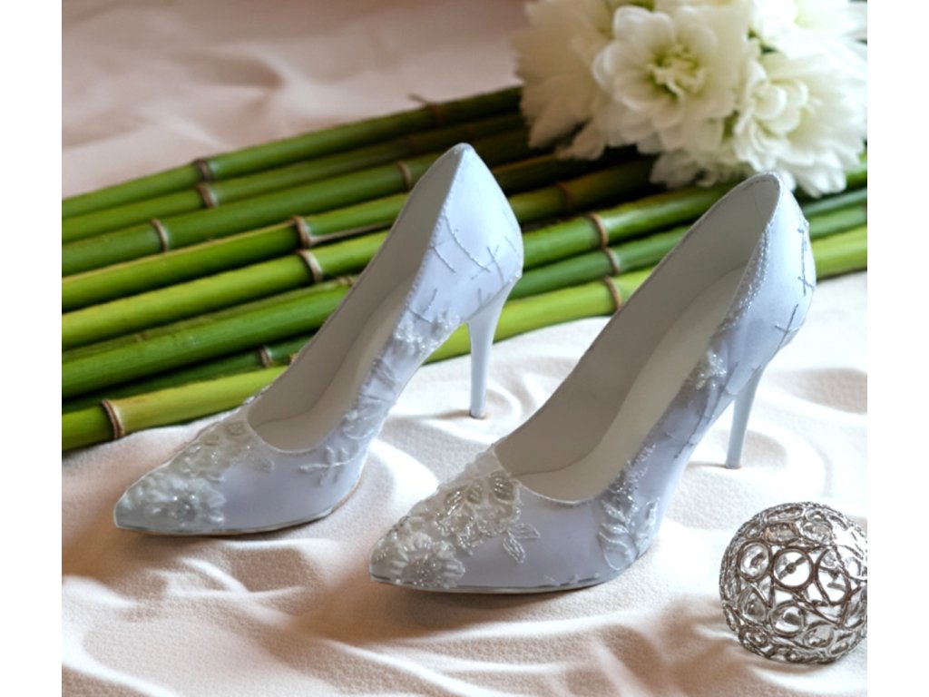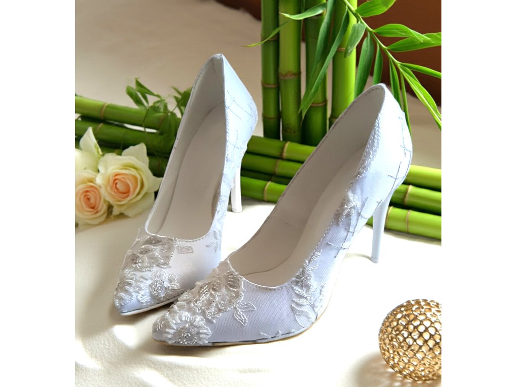 Svadobné lodičky s čipkou, zdobené korálkami a striebornou výšivkou.