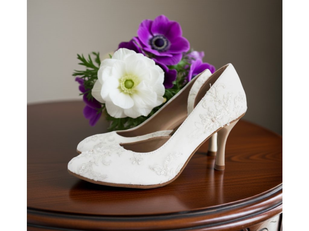 Čipkované svadobné lodičky, zdobené korálikmi.