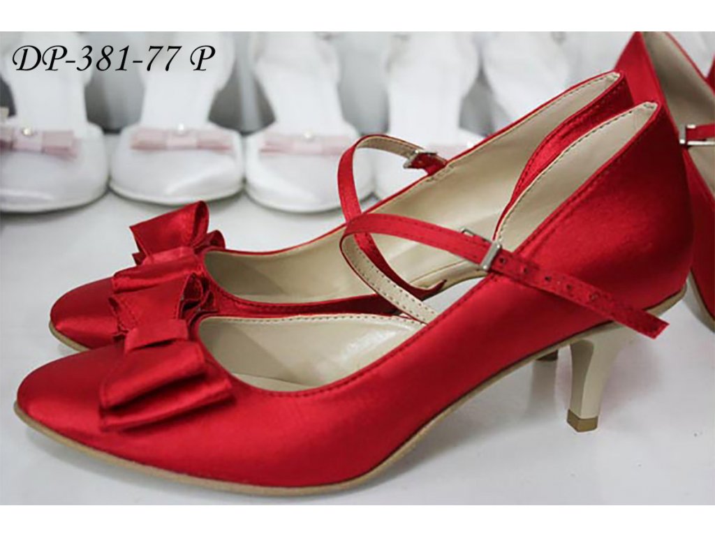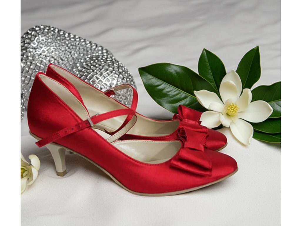 Saténové svadobné lodičky s mašľou a zapínaním - červené