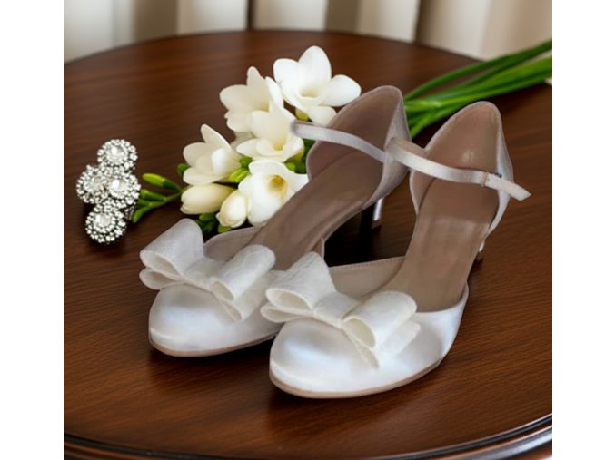 Saténové svadobné topánky s čipkovou mašľou.