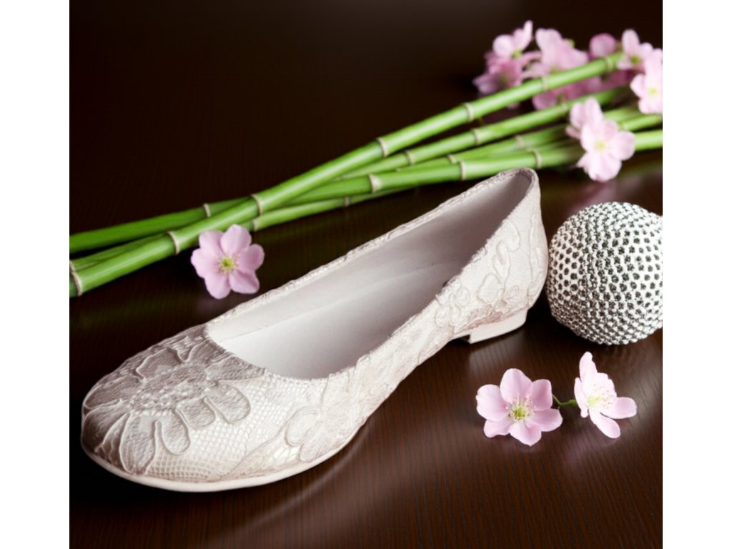 Saténové svadobné balerínky potiahnuté čipkou.