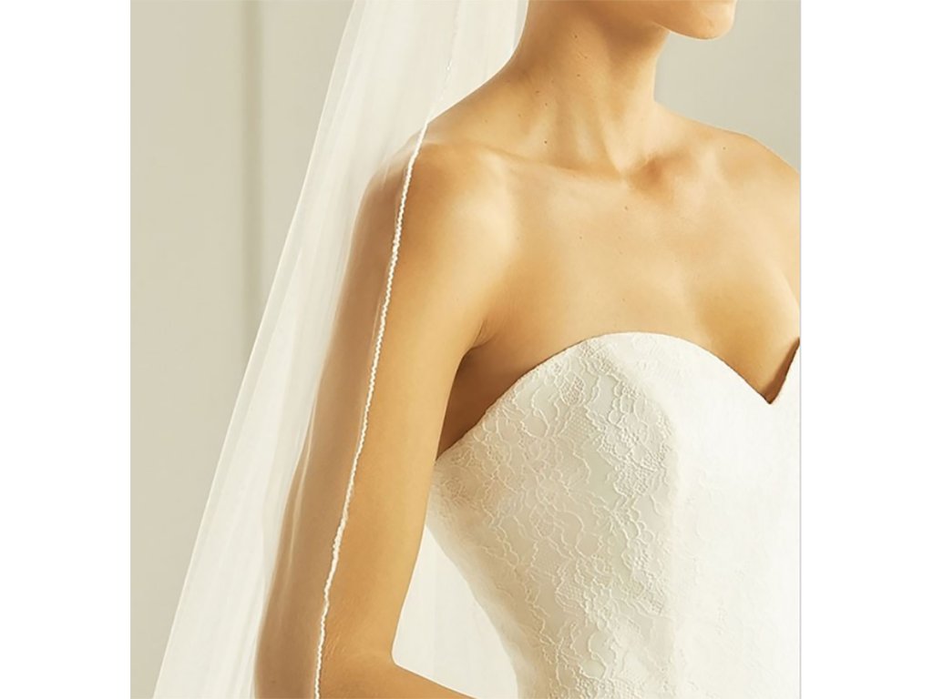 Dlhý svadobný závoj lemovaný drobnými korálikmi.
