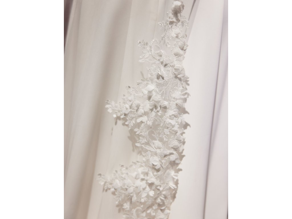 Dlhý svadobný závoj zdobený luxusnou čipkou s 3D kvetmi.