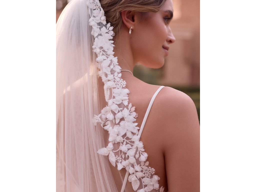Dlhý svadobný závoj lemovaný luxusnou kvetinovou čipkou.