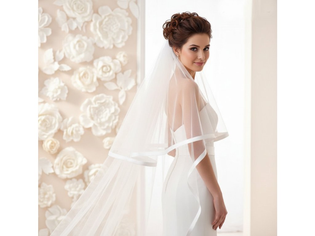 Dlhý svadobný závoj lemovaný saténovou stuhou.