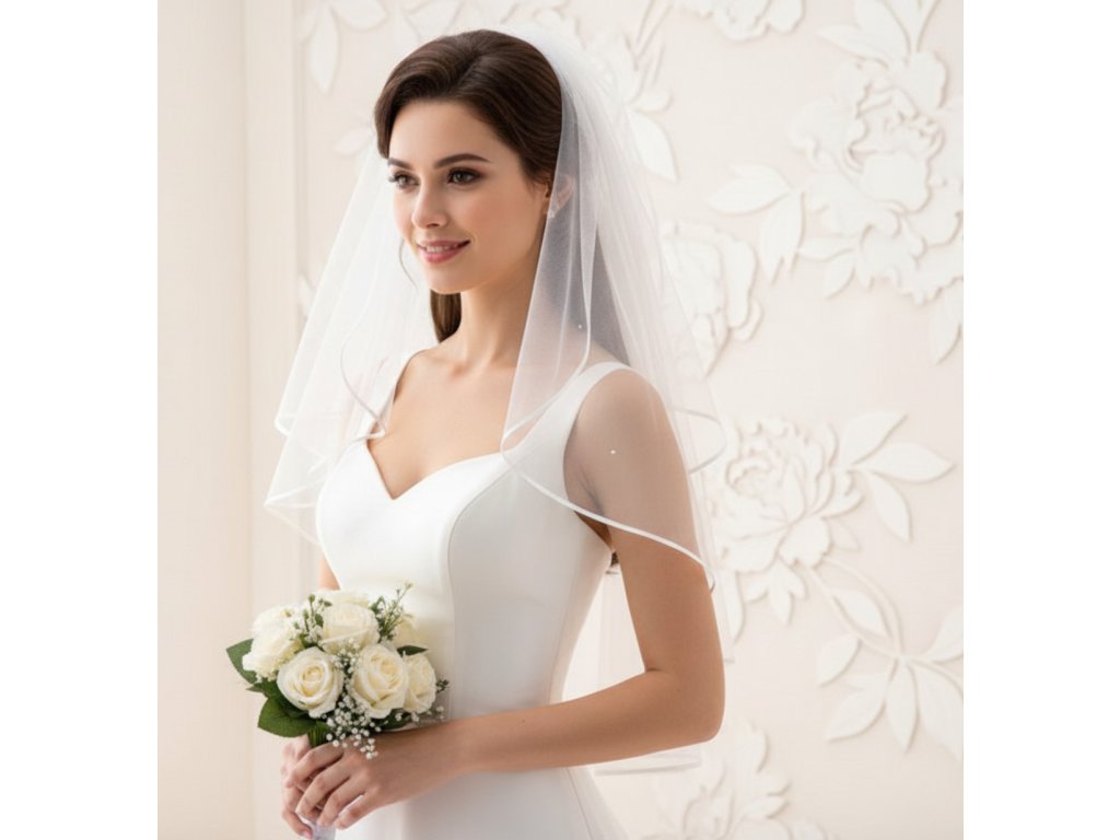 Krátky svadobný závoj lemovaný saténom a zdobený kryštálmi.