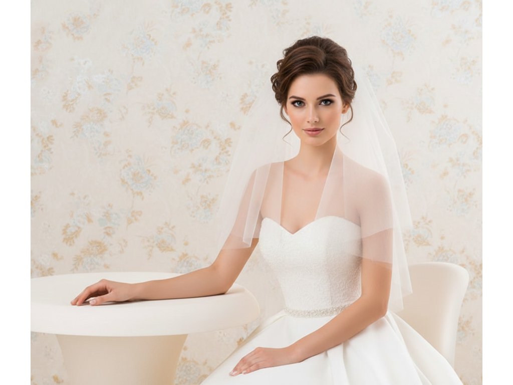 Trblietavý svadobný tylový závoj s prehodením cez tvár.