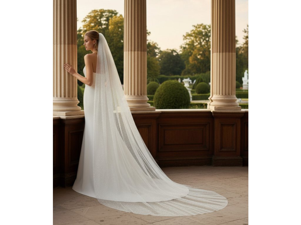 Trblietavý svadobný závoj dlhý, bez lemovania.